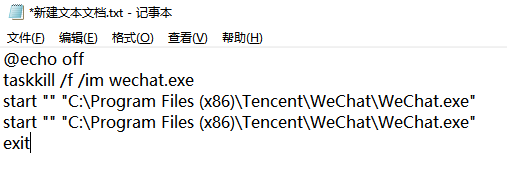 4.在文件中键入以下代码,把C:\Program Files (x86)\Tencent\WeChat\WeChat.exe替换成步骤2中复制的内容